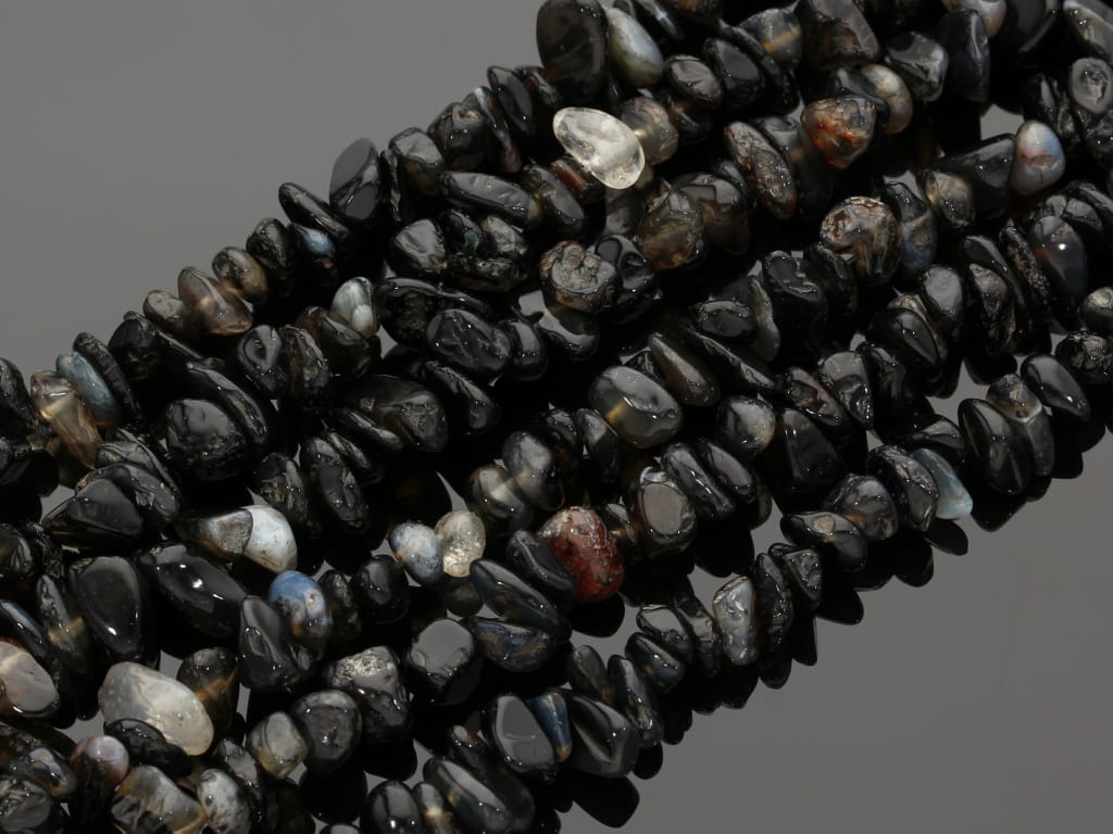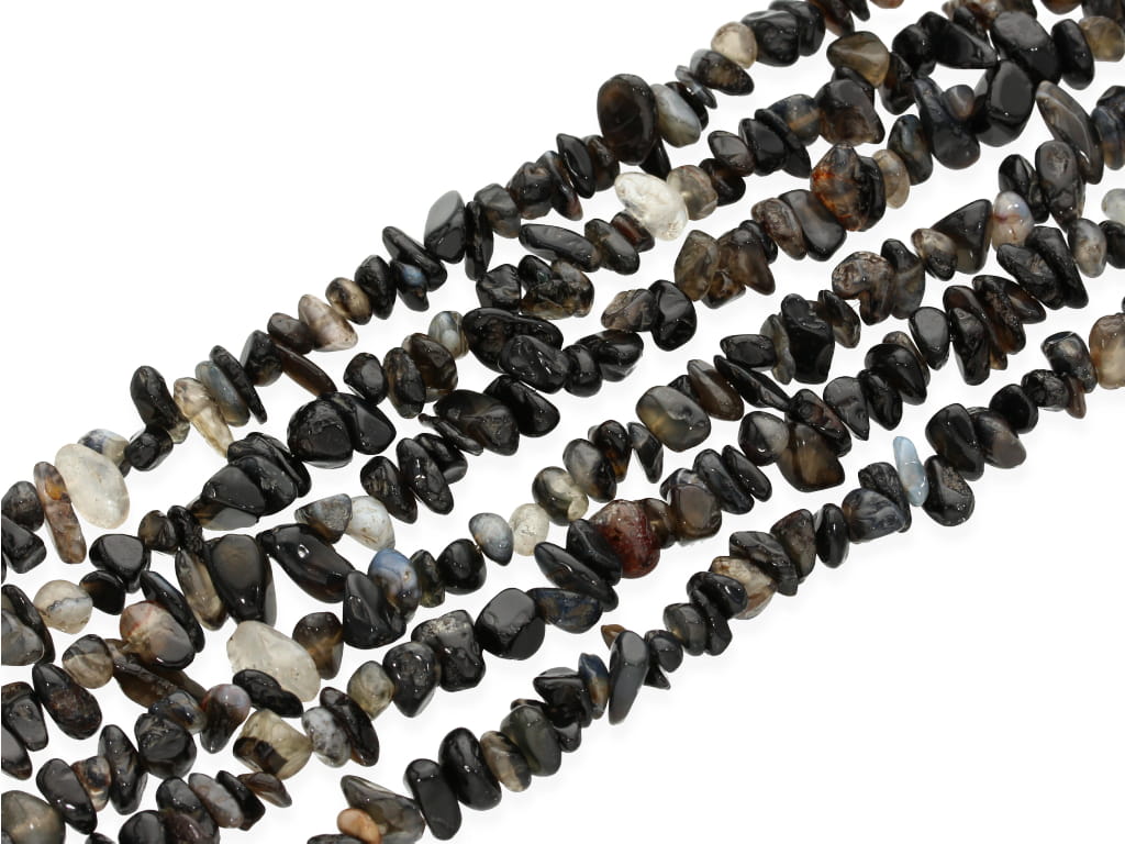Czarny agat w kształcie sieczki, sprzedawany w sznurach bez zapięcia, służących do samodzielnego tworzenia biżuterii. Cena dotyczy jednego sznura, który podczas kompletowania zamówienia jest wybierany losowo.