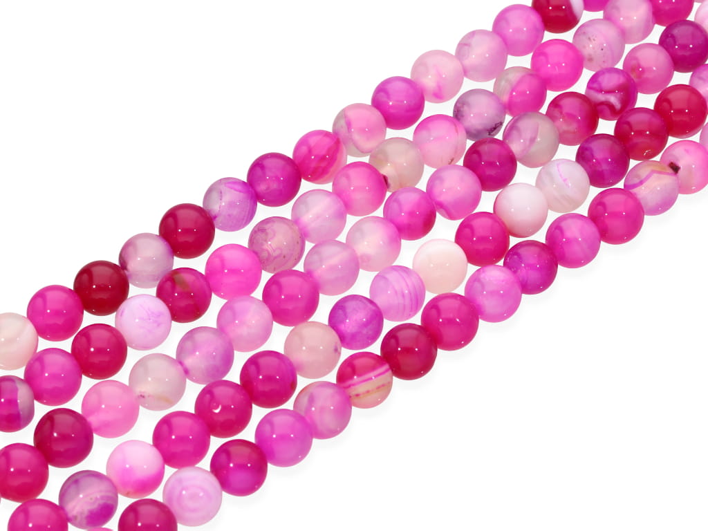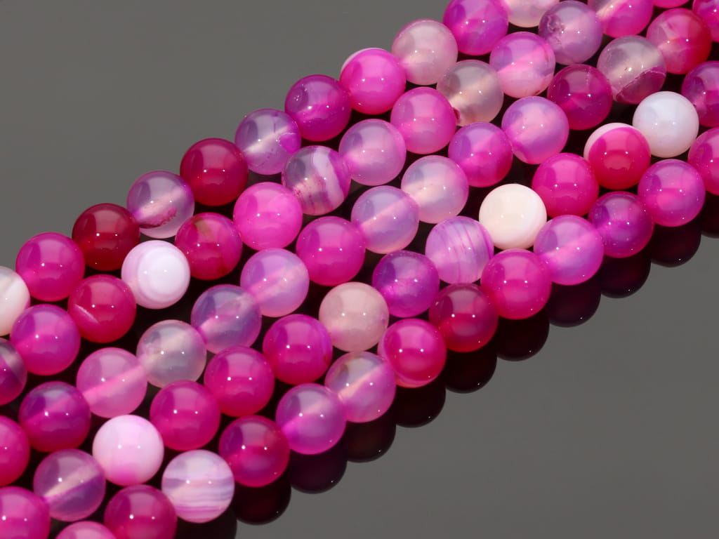 Agat pasiasty w kształcie kulki, sprzedawany w sznurach bez zapięcia, służących do samodzielnego tworzenia biżuterii. Cena dotyczy jednego sznura, który podczas kompletowania zamówienia jest wybierany losowo.