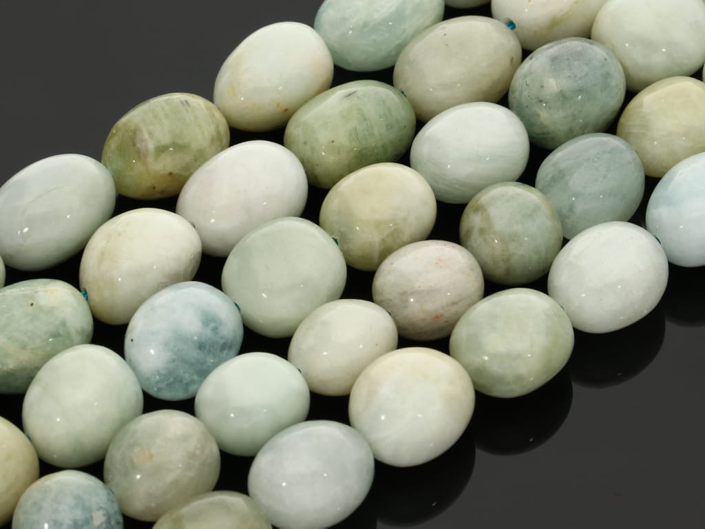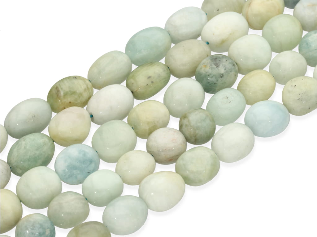 Akwamaryn w kształcie obłej bryłki, sprzedawany w sznurach bez zapięcia, służących do samodzielnego tworzenia biżuterii. Cena dotyczy jednego sznura, który podczas kompletowania zamówienia jest wybierany losowo.