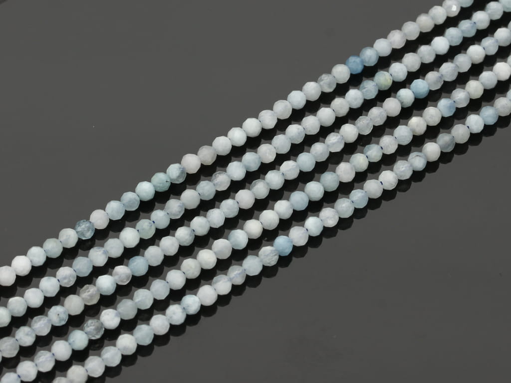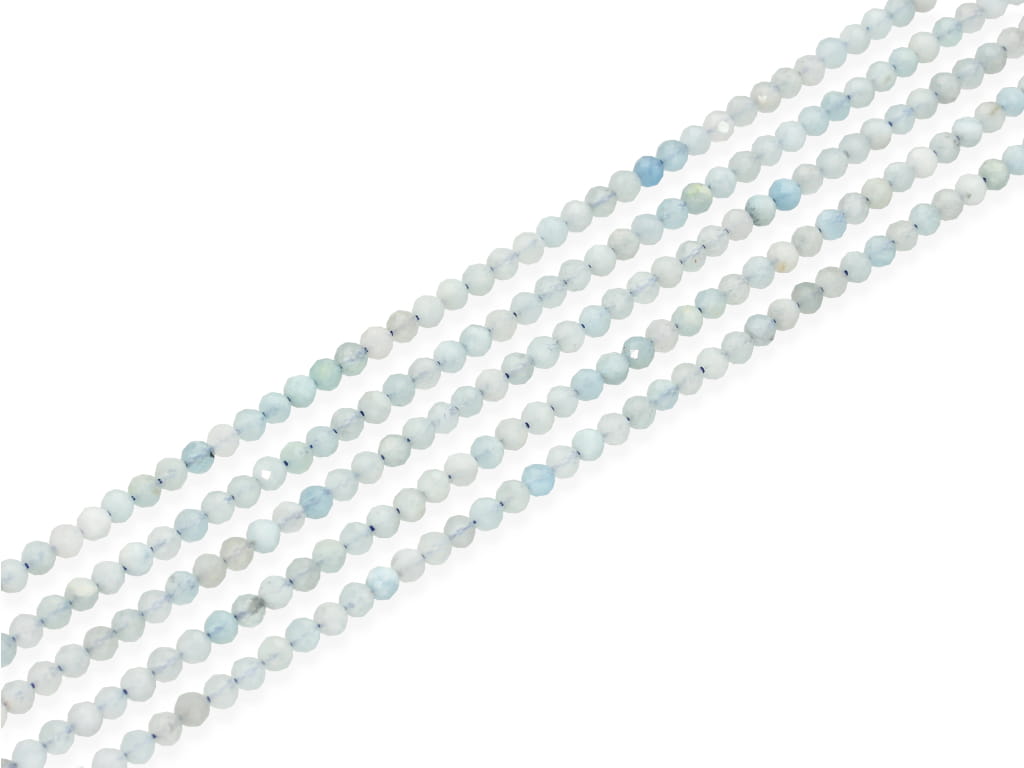 Akwamaryn gradacji jakościowej AB w kształcie fasetowanej kulki, sprzedawany w sznurach bez zapięcia, służących do samodzielnego tworzenia biżuterii. Cena dotyczy jednego sznura, który podczas kompletowania zamówienia jest wybierany losowo.