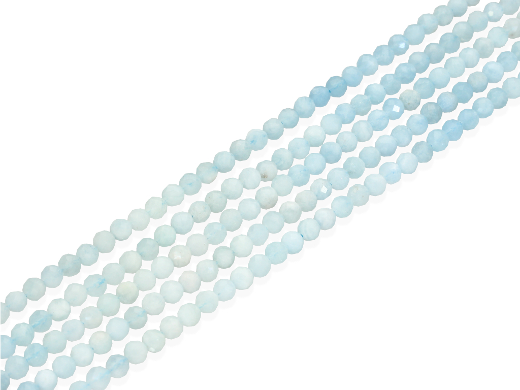 Akwamaryn w kształcie fasetowanej kulki, sprzedawany w sznurach bez zapięcia, służących do samodzielnego tworzenia biżuterii. Cena dotyczy jednego sznura, który podczas kompletowania zamówienia jest wybierany losowo.