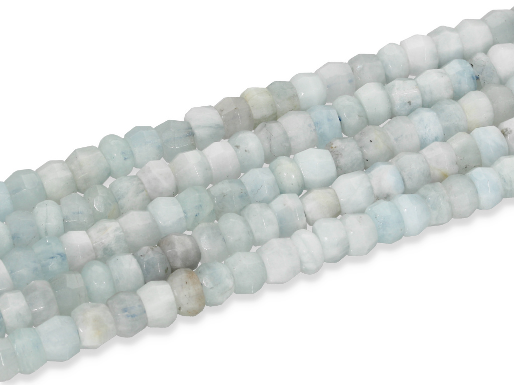 Akwamaryn w kształcie nieregularnej, fasetowanej oponki, sprzedawany w sznurach bez zapięcia, służących do samodzielnego tworzenia biżuterii. Cena dotyczy jednego sznura, który podczas kompletowania zamówienia jest wybierany losowo.