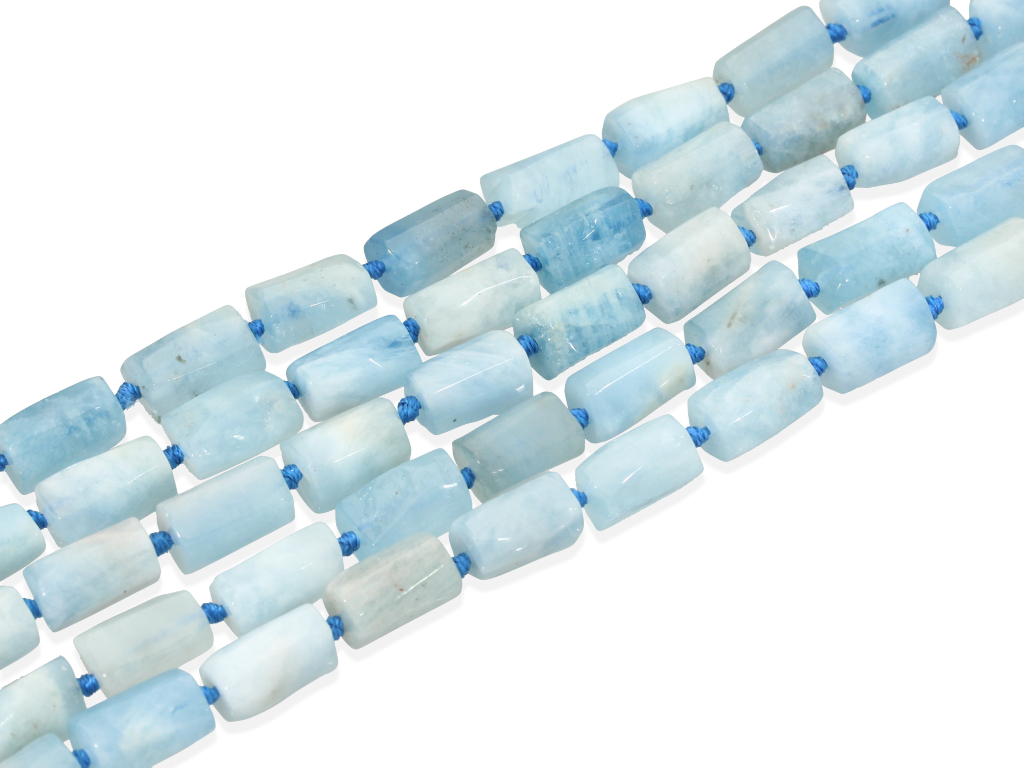Akwamaryn w kształcie ciosanego walca, sprzedawany w sznurach bez zapięcia, służących do samodzielnego tworzenia biżuterii. Cena dotyczy jednego sznura, który podczas kompletowania zamówienia jest wybierany losowo.
