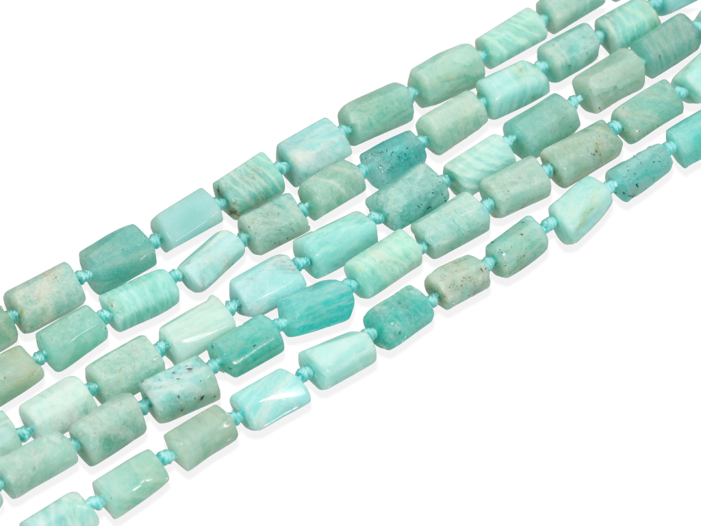 Amazonit w kształcie ciosanego walca, sprzedawany w sznurach bez zapięcia, służących do samodzielnego tworzenia biżuterii. Cena dotyczy jednego sznura, który podczas kompletowania zamówienia jest wybierany losowo.
