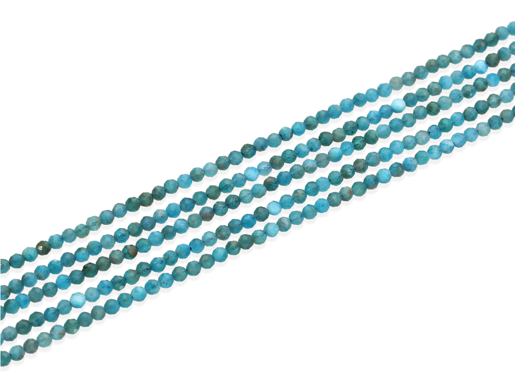 Apatyt gradacji jakościowej AA w kształcie fasetowanej kulki, sprzedawany w sznurach bez zapięcia, służących do samodzielnego tworzenia biżuterii. Cena dotyczy jednego sznura, który podczas kompletowania zamówienia jest wybierany losowo.