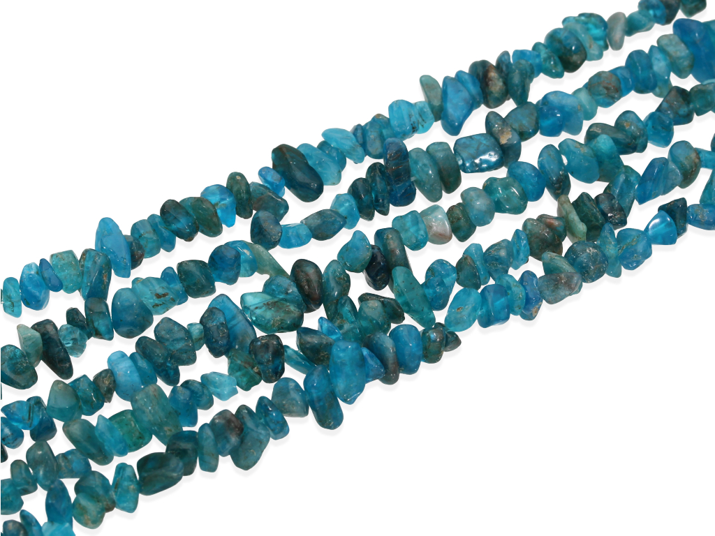 Apatyt w nieregularnym kształcie, sprzedawany w sznurach bez zapięcia, służących do samodzielnego tworzenia biżuterii. Cena dotyczy jednego sznura, który podczas kompletowania zamówienia jest wybierany losowo.