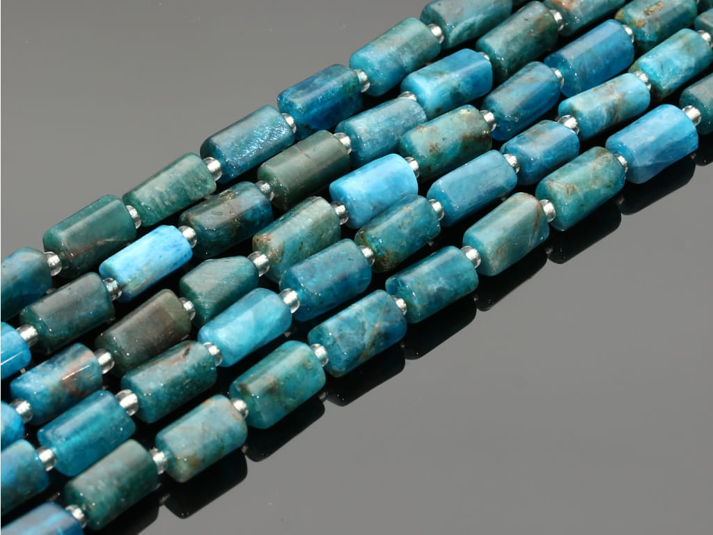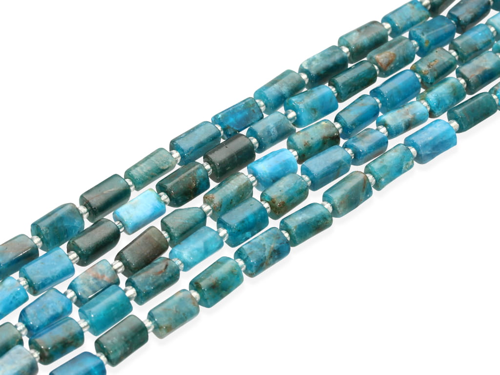 Apatyt w kształcie ciosanego walca, sprzedawany w sznurach bez zapięcia, służących do samodzielnego tworzenia biżuterii. Cena dotyczy jednego sznura, który podczas kompletowania zamówienia jest wybierany losowo.