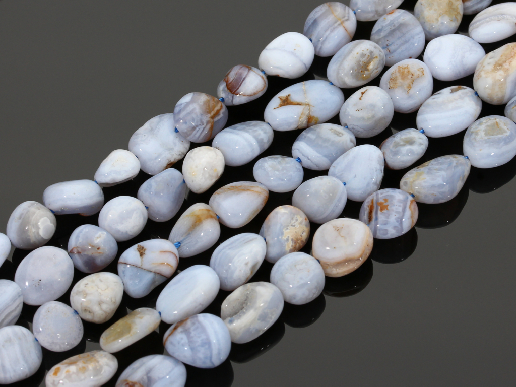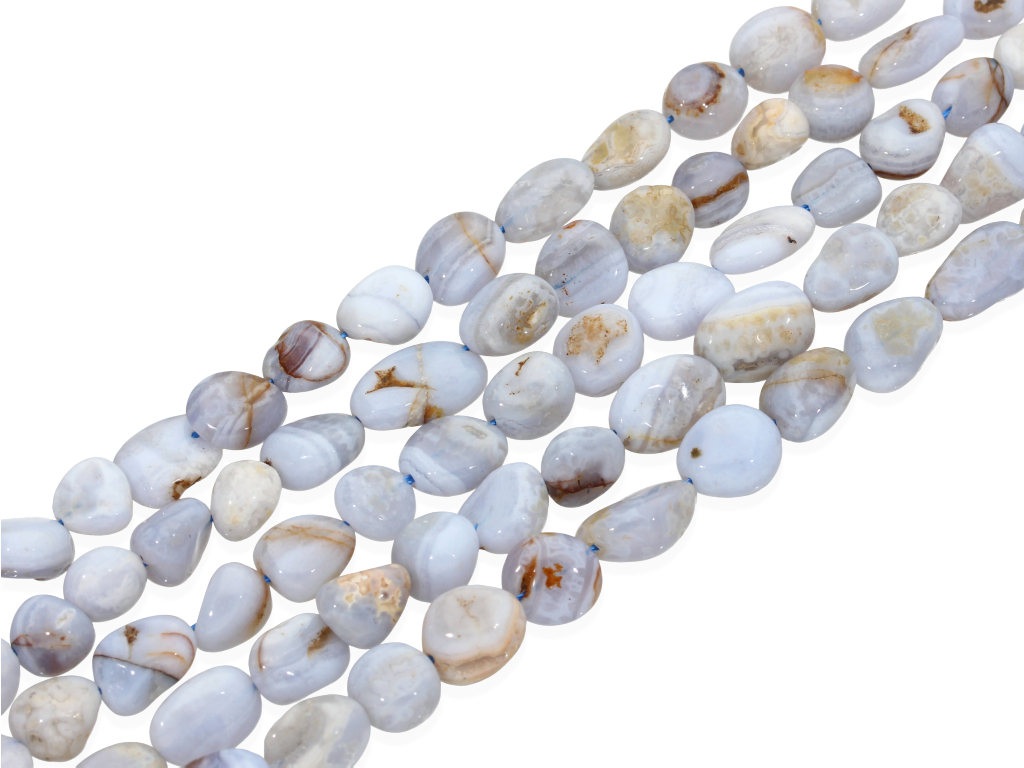 Chalcedon o nieregularnym kształcie, sprzedawany w sznurach bez zapięcia, służących do samodzielnego tworzenia biżuterii. Cena dotyczy jednego sznura, który podczas kompletowania zamówienia jest wybierany losowo.