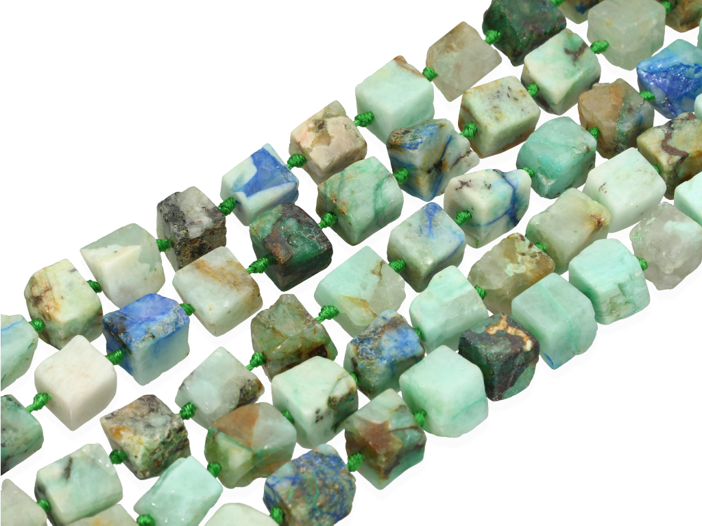 Chryzokola w kształcie nieregularnej kostki, sprzedawana w sznurach bez zapięcia, służących do samodzielnego tworzenia biżuterii. Cena dotyczy jednego sznura, który podczas kompletowania zamówienia jest wybierany losowo.