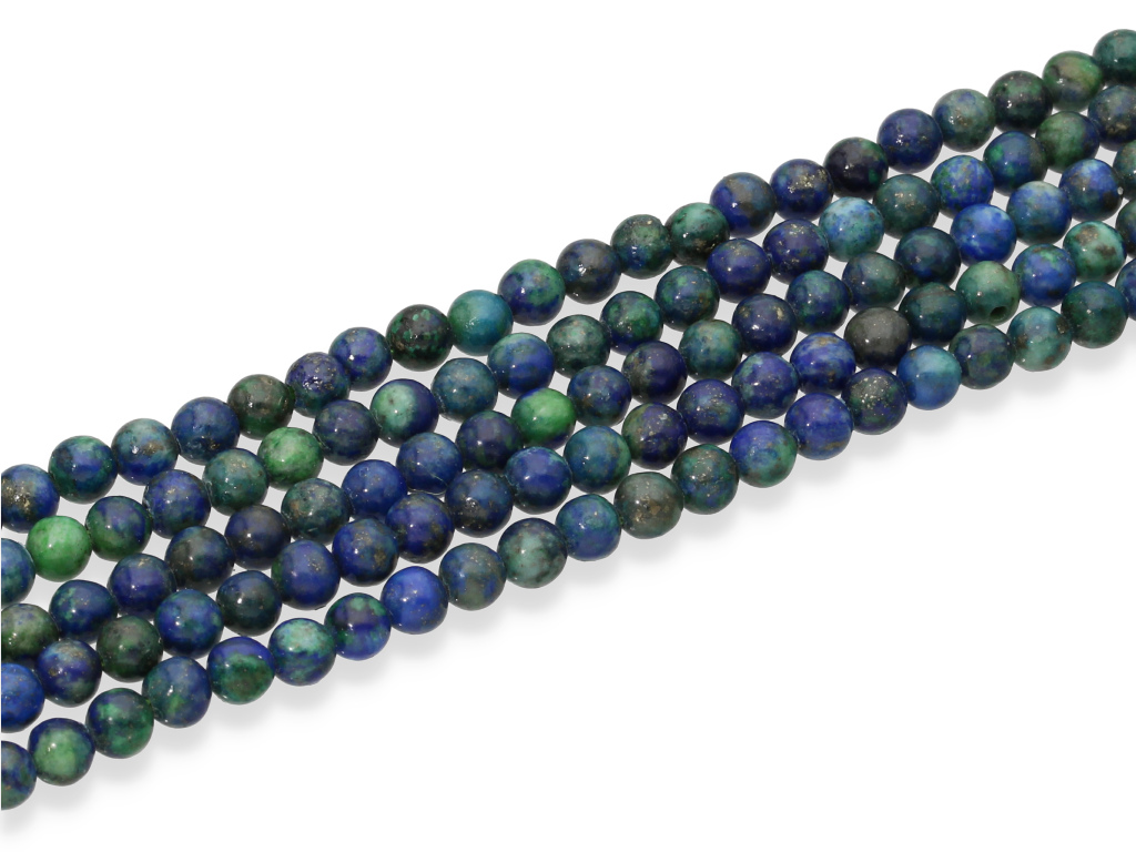 Chryzokola z lapisem lazuli w kształcie kulki, sprzedawane w sznurach bez zapięcia, służących do samodzielnego tworzenia biżuterii. Cena dotyczy jednego sznura, który podczas kompletowania zamówienia jest wybierany losowo.