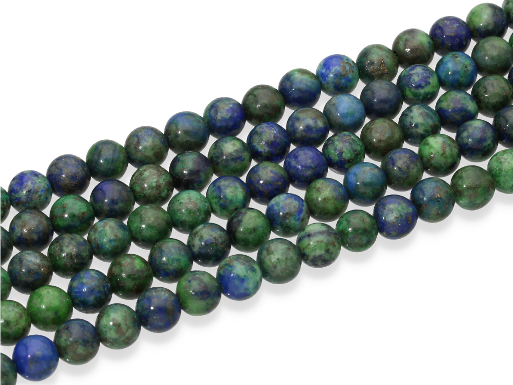 Chryzokola z lapisem lazuli w kształcie kulki, sprzedawane w sznurach bez zapięcia, służących do samodzielnego tworzenia biżuterii. Cena dotyczy jednego sznura o długości ~ 19cm, który podczas kompletowania zamówienia jest wybierany losowo.