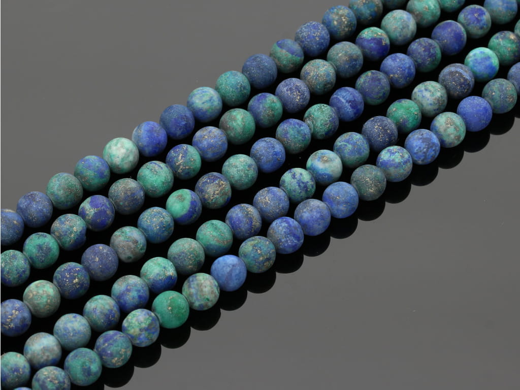 Chryzokola z lapisem lazuli w kształcie kulki, sprzedawane w sznurach bez zapięcia, służących do samodzielnego tworzenia biżuterii. Cena dotyczy jednego sznura, który podczas kompletowania zamówienia jest wybierany losowo.
