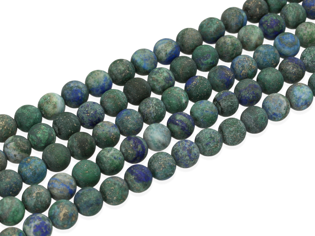 Chryzokola z lapisem lazuli w kształcie kulki, sprzedawane w sznurach bez zapięcia, służących do samodzielnego tworzenia biżuterii. Cena dotyczy jednego sznura, który podczas kompletowania zamówienia jest wybierany losowo.