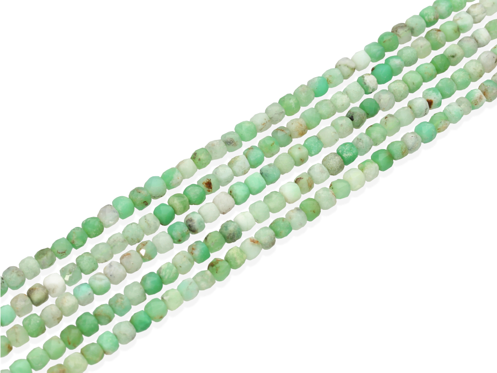 Chryzopraz w kształcie fasetowanej kostki, sprzedawany w sznurach bez zapięcia, służących do samodzielnego tworzenia biżuterii. Cena dotyczy jednego sznura, który podczas kompletowania zamówienia jest wybierany losowo.