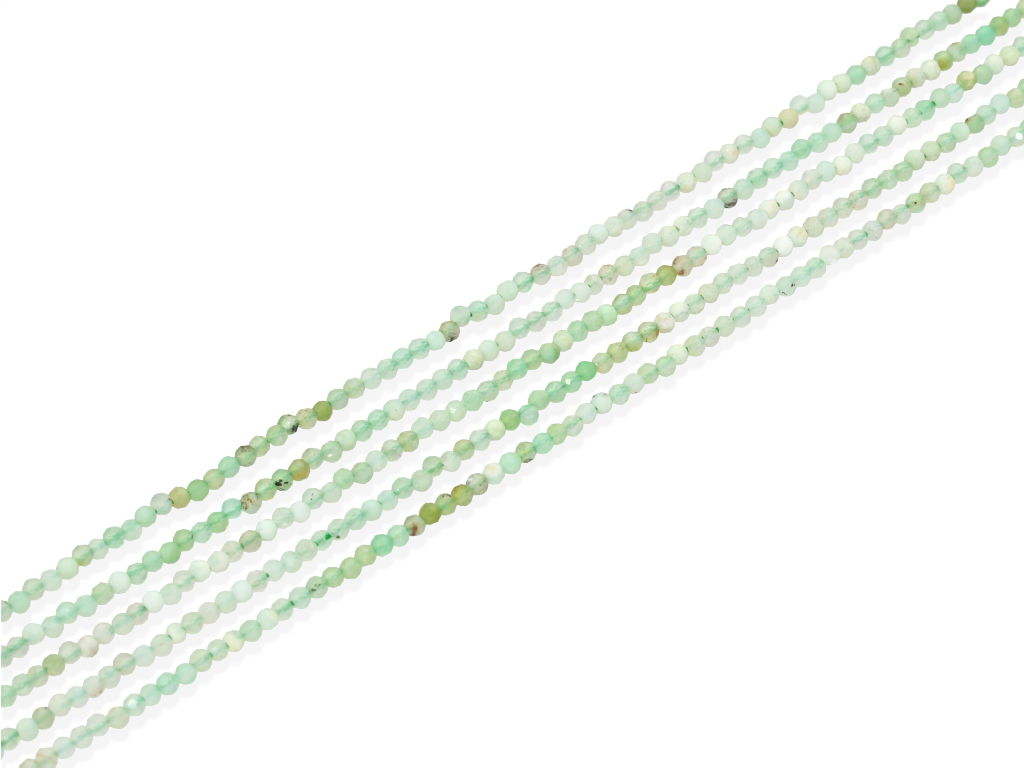 Chryzopraz w kształcie fasetowanej kulki, sprzedawany w sznurach bez zapięcia, służących do samodzielnego tworzenia biżuterii. Cena dotyczy jednego sznura, który podczas kompletowania zamówienia jest wybierany losowo.