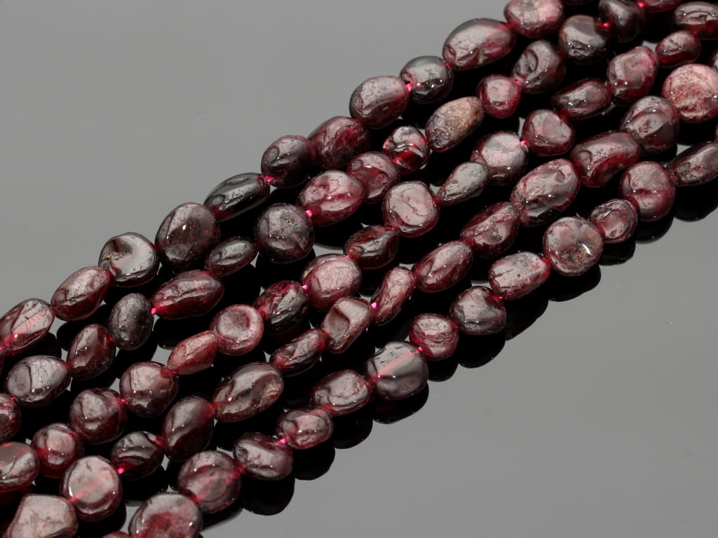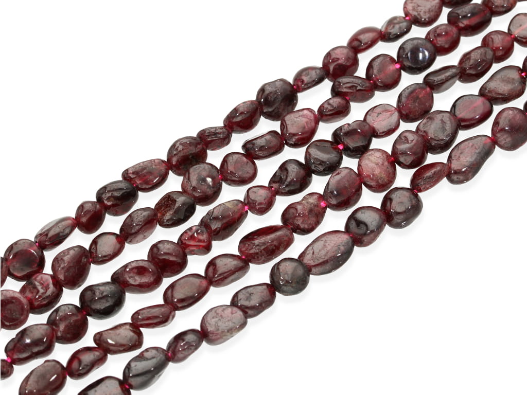 Granat w formie bębnowanej bryłki, sprzedawany w sznurach bez zapięcia, służących do samodzielnego tworzenia biżuterii. Cena dotyczy jednego sznura, który podczas kompletowania zamówienia jest wybierany losowo.