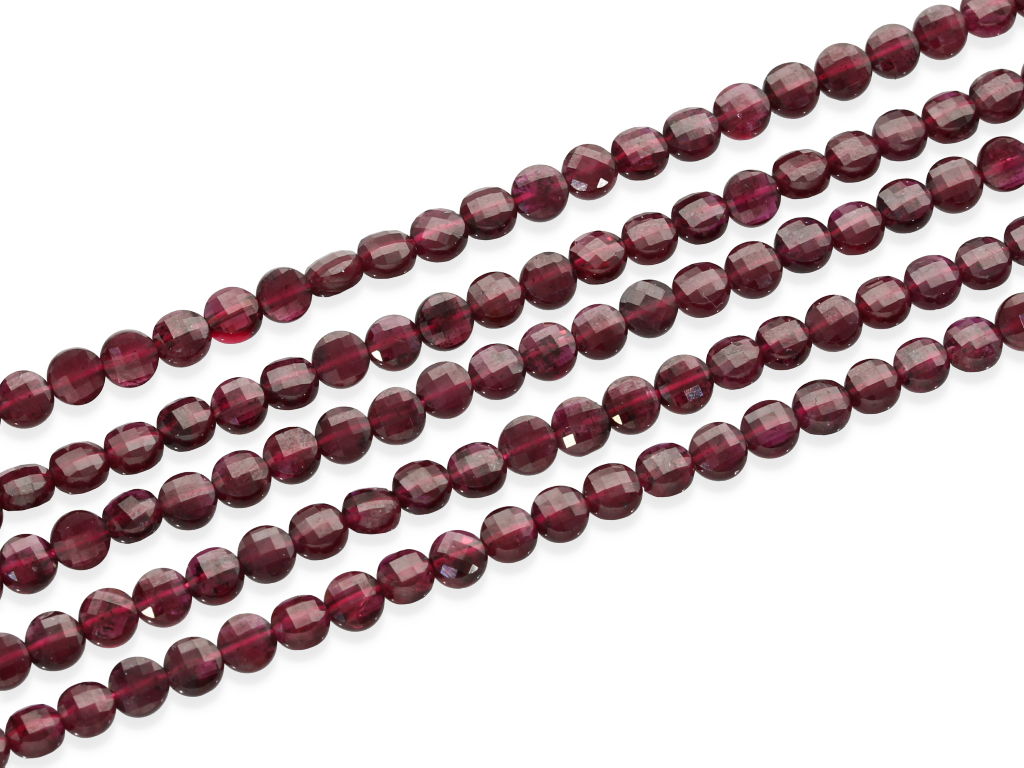 Granat w kształcie fasetowanej monety, sprzedawany w sznurach bez zapięcia, służących do samodzielnego tworzenia biżuterii. Cena dotyczy jednego sznura, który podczas kompletowania zamówienia jest wybierany losowo.
