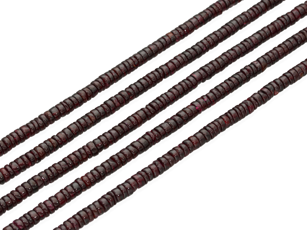 Granat gradacji jakościowej B w kształcie nieregularnych plasterków, sprzedawany w sznurach bez zapięcia, służących do samodzielnego tworzenia biżuterii. Cena dotyczy jednego sznura, który podczas kompletowania zamówienia jest wybierany losowo.