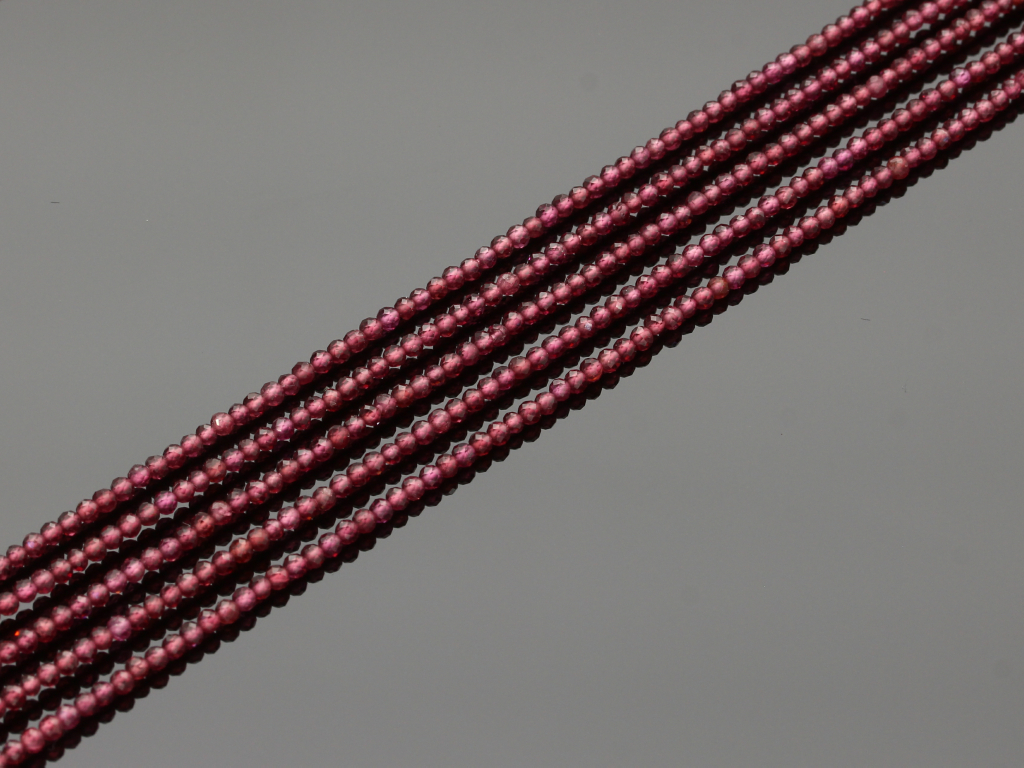 Granat rodolitowy gradacji jakościowej AAA w kształcie fasetowanej kulki, sprzedawany w sznurach bez zapięcia, służących do samodzielnego tworzenia biżuterii. Cena dotyczy jednego sznura, który podczas kompletowania zamówienia jest wybierany losowo.