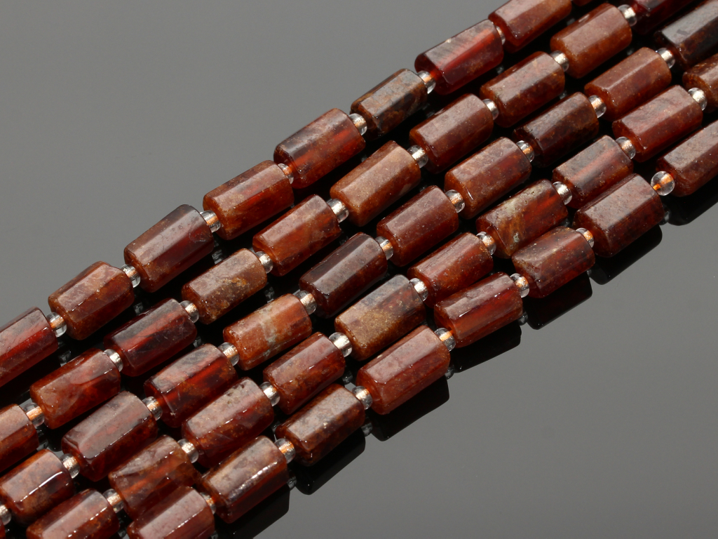 Granat w kształcie ciosanego walca, sprzedawany w sznurach bez zapięcia, służących do samodzielnego tworzenia biżuterii. Cena dotyczy jednego sznura, który podczas kompletowania zamówienia jest wybierany losowo.