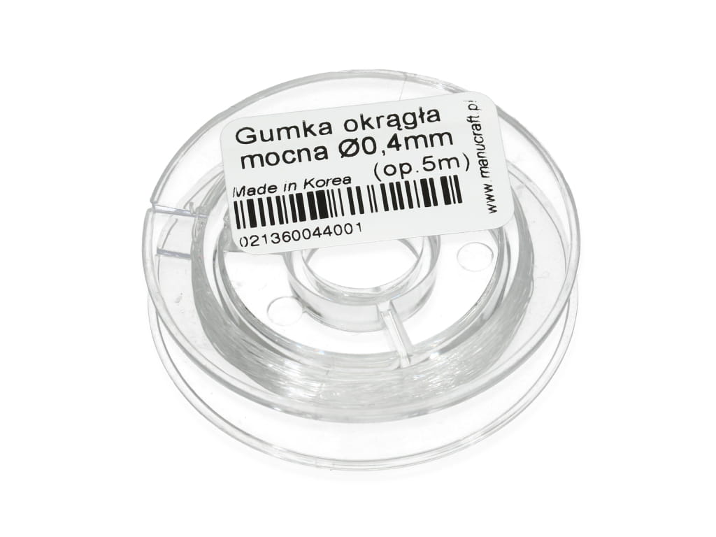 Mocna, okrągła gumka o grubości 0,4mm. Świetnie sprawdzi się jako nośnik do bransoletek oraz pierścionków wykonanych z minerałów lub innych drobnych koralików.