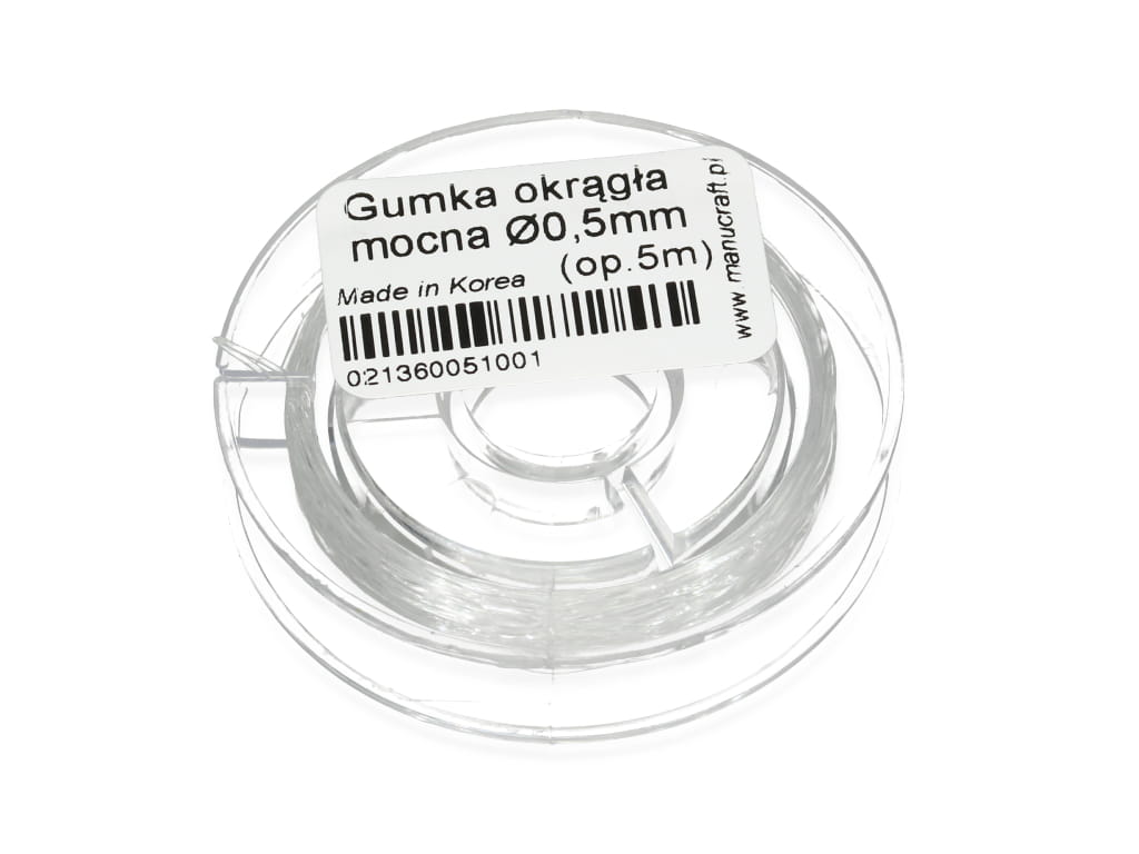 Mocna, okrągła gumka o grubości 0,5mm. Świetnie sprawdzi się jako nośnik do bransoletek oraz pierścionków wykonanych z minerałów lub innych drobnych koralików.