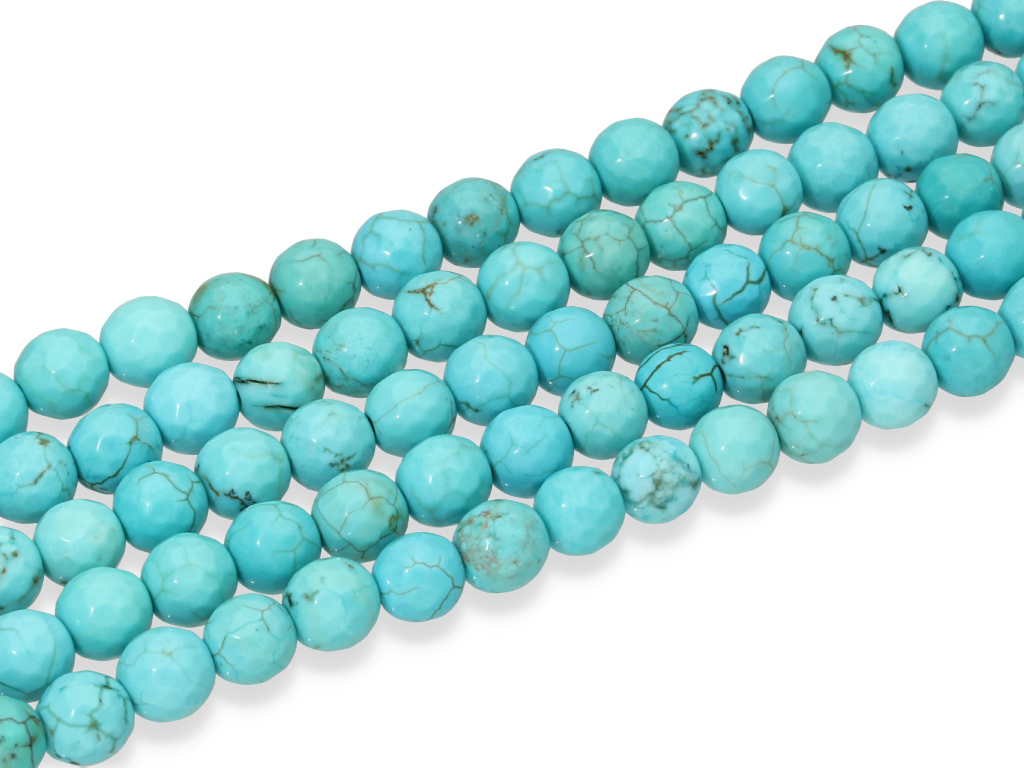 Turkus syntetyczny w kształcie fasetowanej kulki, sprzedawany w sznurach bez zapięcia, służących do samodzielnego tworzenia biżuterii. Cena dotyczy jednego sznura o długości ~ 19 cm, który podczas kompletowania zamówienia jest wybierany losowo.