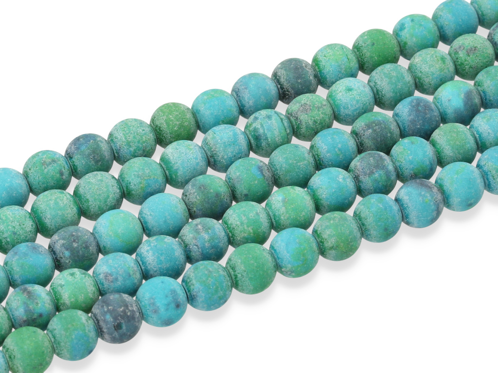 Chryzokola w kształcie kulki, sprzedawane w sznurach bez zapięcia, służących do samodzielnego tworzenia biżuterii. Cena dotyczy jednego sznura o długości ~ 19 cm, który podczas kompletowania zamówienia jest wybierany losowo.