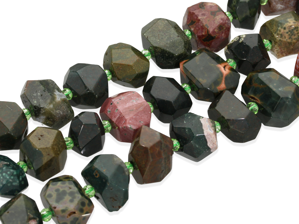 Jaspis w kształcie nieregularnej, ciosanej bryłki, sprzedawany w sznurach bez zapięcia, służących do samodzielnego tworzenia biżuterii. Cena dotyczy jednego sznura o długości ~ 19cm, który podczas kompletowania zamówienia jest wybierany losowo.