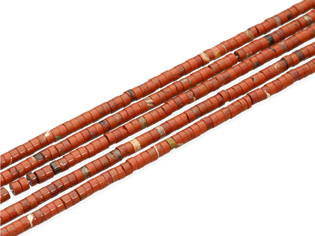 Jaspis w kształcie plasterków, sprzedawany w sznurach bez zapięcia, służących do samodzielnego tworzenia biżuterii. Cena dotyczy jednego sznura, który podczas kompletowania zamówienia jest wybierany losowo.