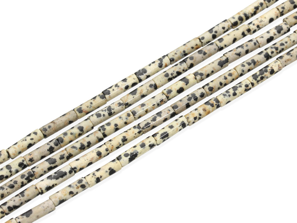 Jaspis dalmatyńczyk w kształcie rurki, sprzedawany w sznurach bez zapięcia, służących do samodzielnego tworzenia biżuterii. Cena dotyczy jednego sznura, który podczas kompletowania zamówienia jest wybierany losowo.