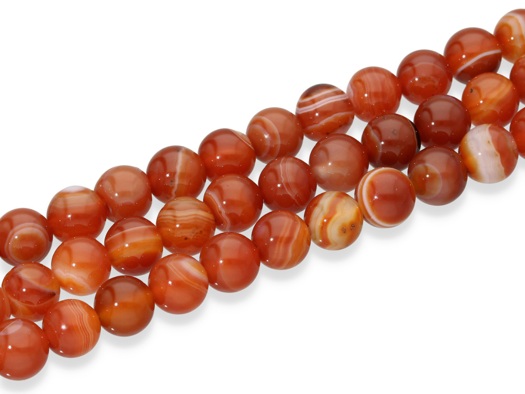 Karneol w kształcie kulki, sprzedawany w sznurach bez zapięcia, służących do samodzielnego tworzenia biżuterii. Cena dotyczy jednego sznura o długości ~ 19 cm, który podczas kompletowania zamówienia jest wybierany losowo.