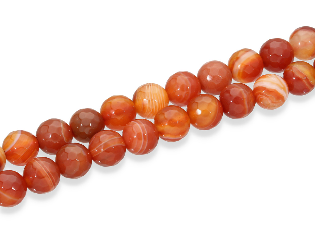 Karneol w kształcie fasetowanej kulki, sprzedawany w sznurach bez zapięcia, służących do samodzielnego tworzenia biżuterii. Cena dotyczy jednego sznura o długości ~ 19 cm, który podczas kompletowania zamówienia jest wybierany losowo.