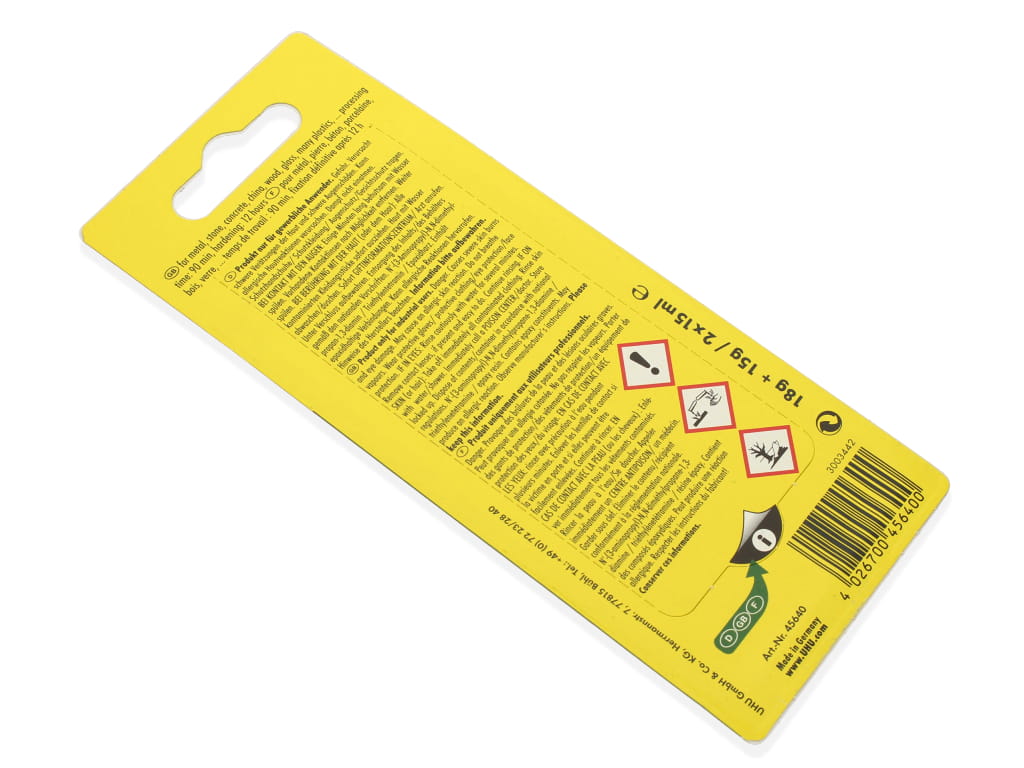 Klej wstępnie zastyga w ciągu ~2 godzin. Po około 12 godzinach uzyskujemy trwałe, wyjątkowo mocne połączenie. Klej nie zawiera rozpuszczalników i w czasie zastygania nie zmienia swojej objętości. Świetnie nadaje się do wypełniania pustych przestrzeni. Tworzy bezbarwną spoinę odporną na obciążenia i łatwą w obróbce (szlifowanie, malowanie...).