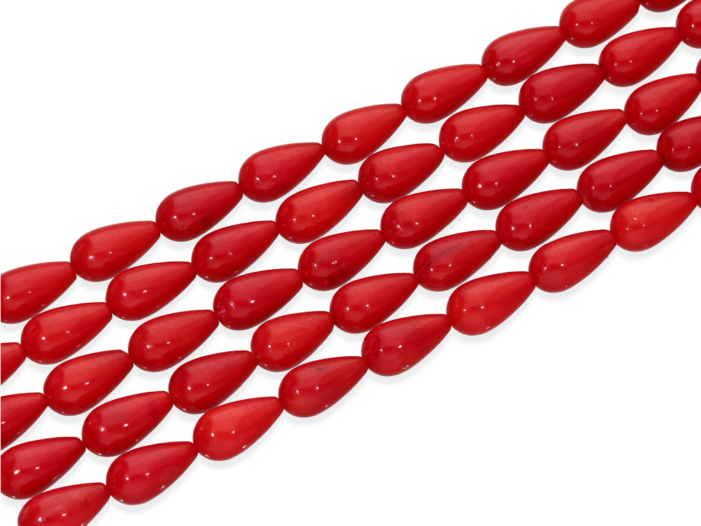 Koral czerwony w kształcie kropli, sprzedawany w sznurach bez zapięcia, służących do samodzielnego tworzenia biżuterii. Cena dotyczy jednego sznura o długości ~ 19 cm, który podczas kompletowania zamówienia jest wybierany losowo.