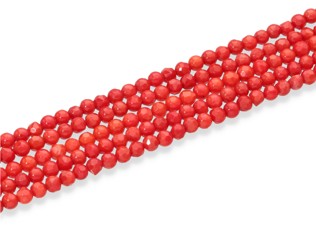 Koral czerwony w kształcie fasetowanej kulki, sprzedawany w sznurach bez zapięcia, służących do samodzielnego tworzenia biżuterii. Cena dotyczy jednego sznura, który podczas kompletowania zamówienia jest wybierany losowo.