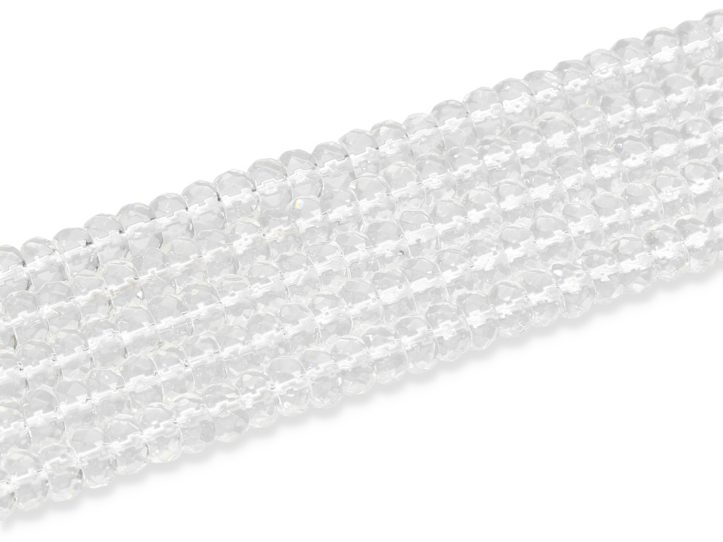Kryształ górski w kształcie oponki fasetowanej, sprzedawany w sznurach bez zapięcia, służących do samodzielnego tworzenia biżuterii. Cena dotyczy jednego sznura, który podczas kompletowania zamówienia jest wybierany losowo.