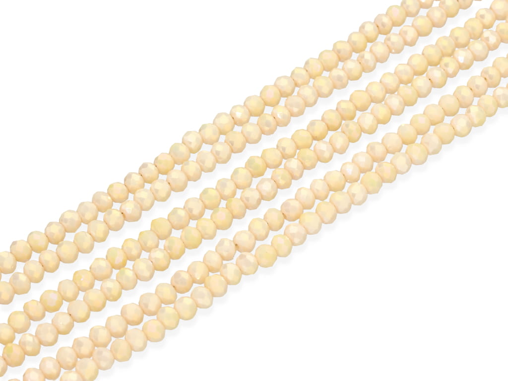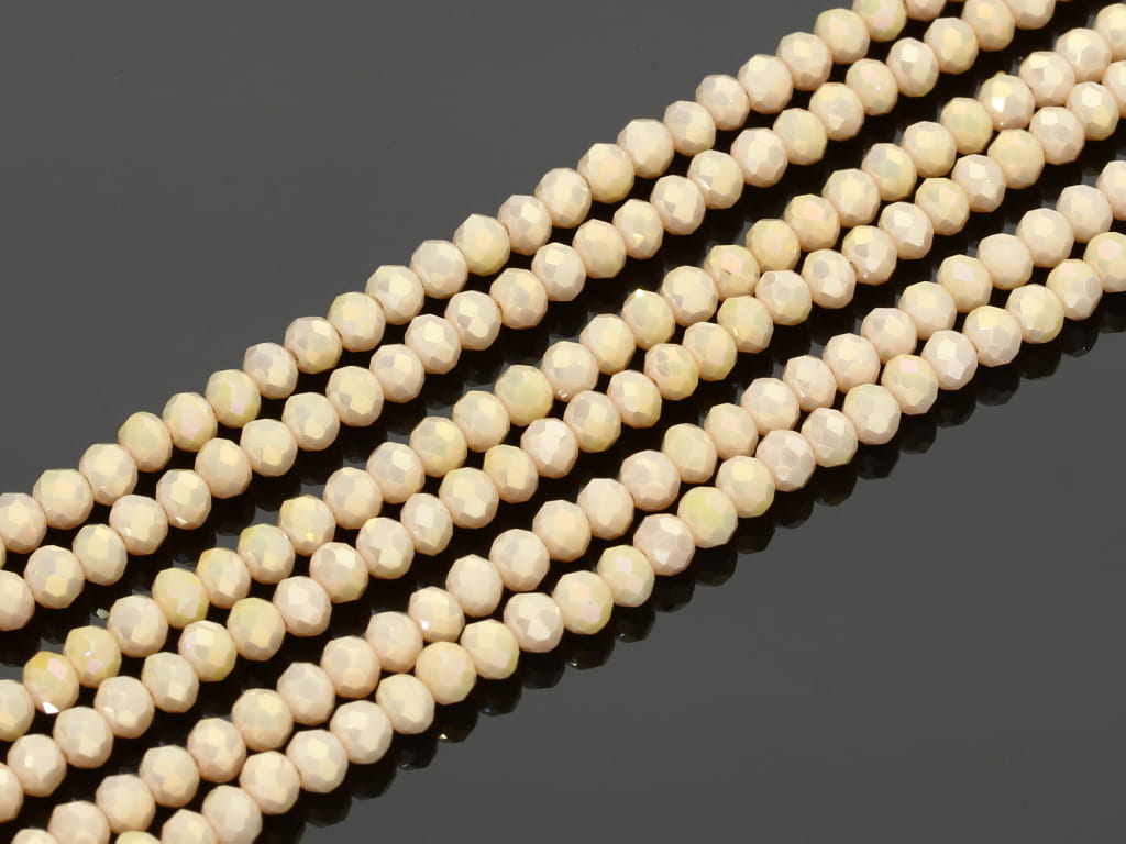 Szkło kryształowe w kształcie fasetowanej oponki, sprzedawane w sznurach bez zapięcia, służących do samodzielnego tworzenia biżuterii. Cena dotyczy jednego sznura, który podczas kompletowania zamówienia jest wybierany losowo.