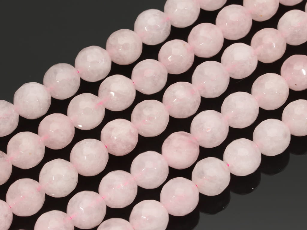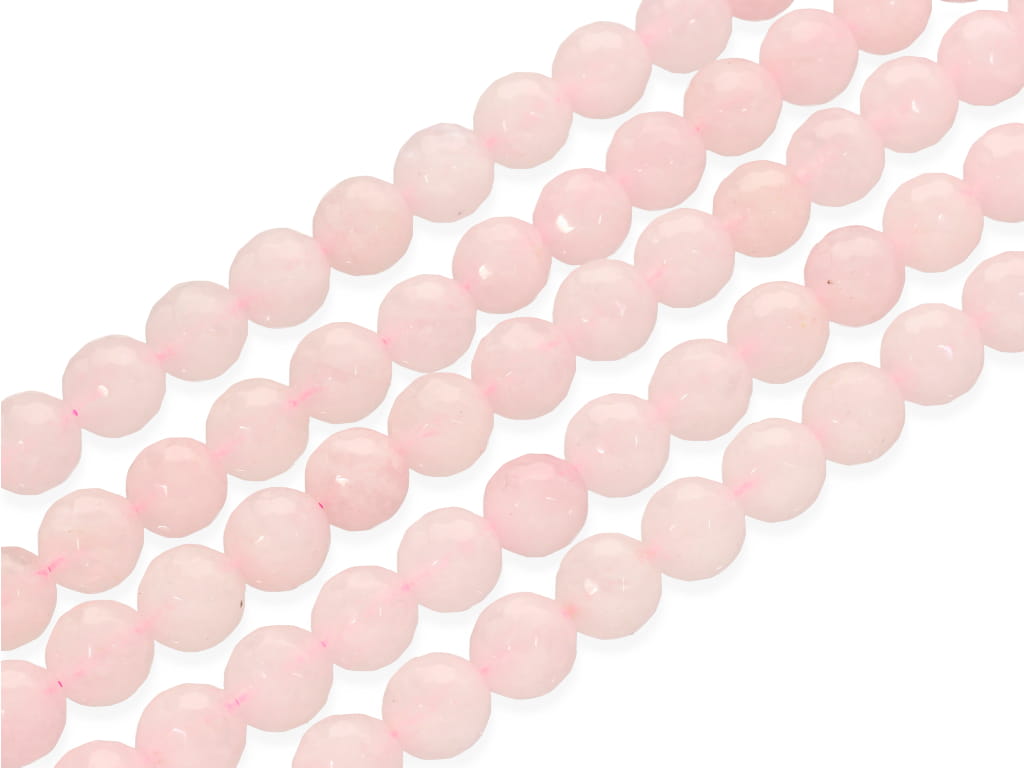 Kwarc różowy w kształcie fasetowanej kulki, sprzedawany w sznurach bez zapięcia, służących do samodzielnego tworzenia biżuterii. Cena dotyczy jednego sznura, który podczas kompletowania zamówienia jest wybierany losowo.