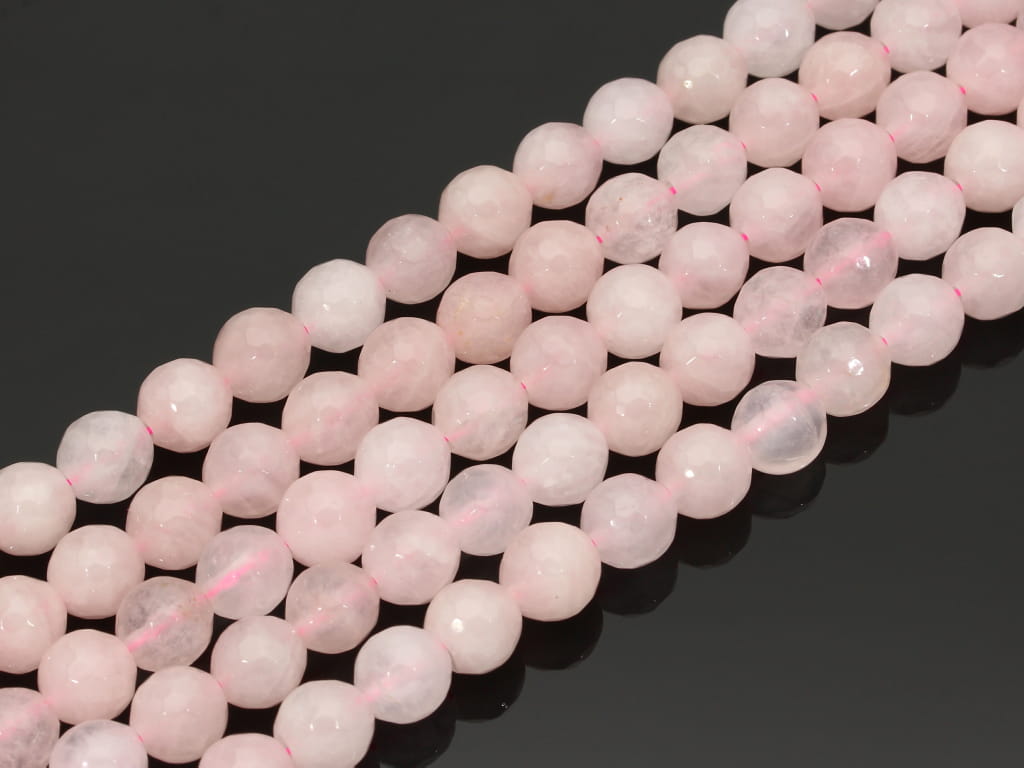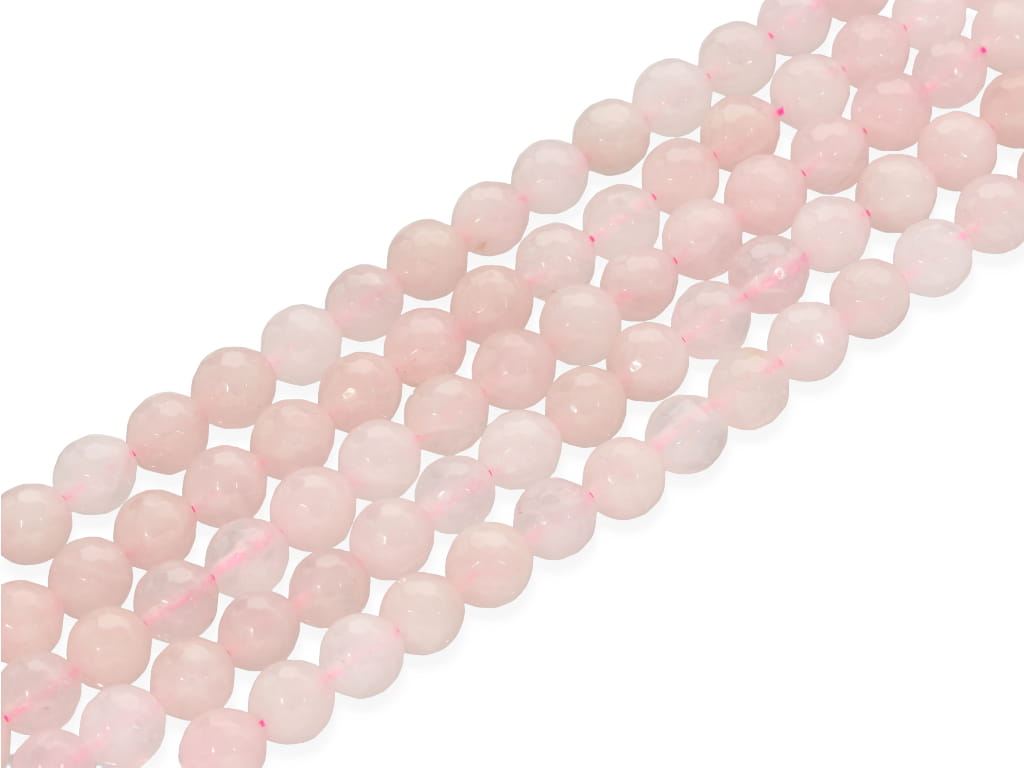 Kwarc różowy w kształcie fasetowanej kulki, sprzedawany w sznurach bez zapięcia, służących do samodzielnego tworzenia biżuterii. Cena dotyczy jednego sznura, który podczas kompletowania zamówienia jest wybierany losowo.