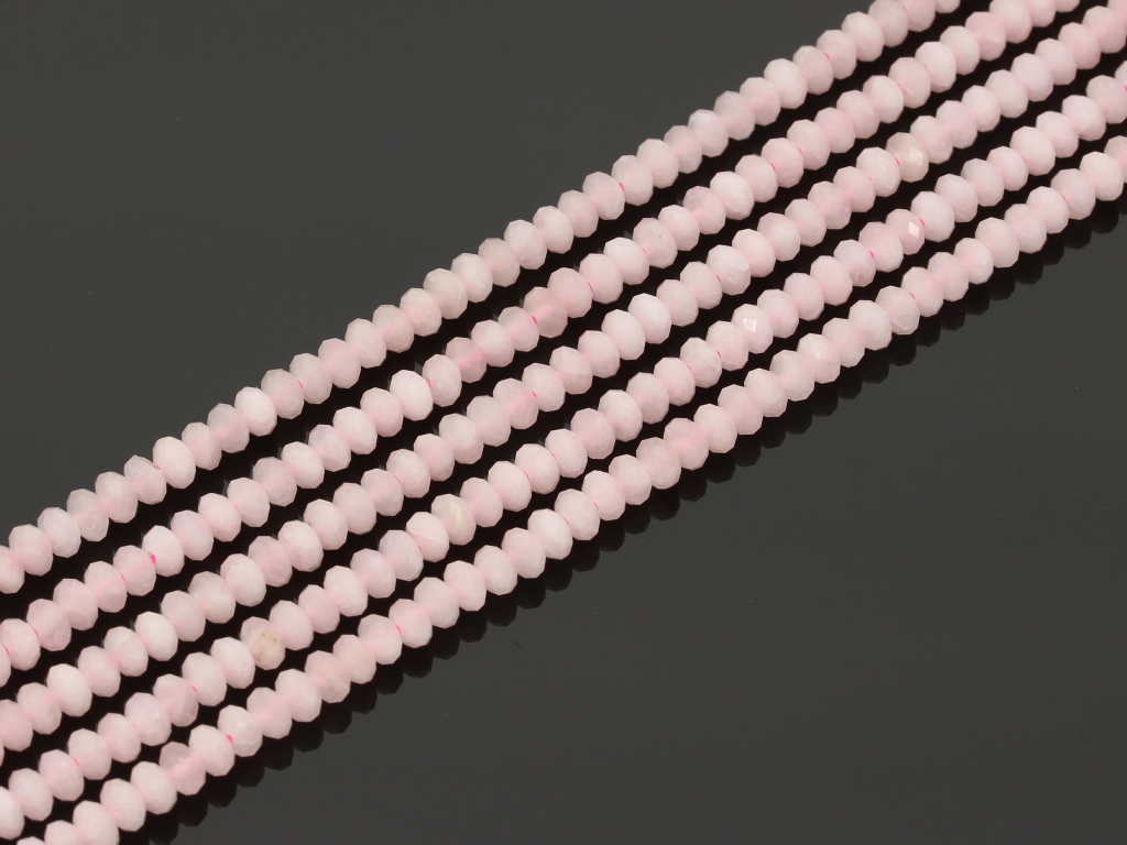 Kwarc różowy w kształcie fasetowanej oponki, sprzedawany w sznurach bez zapięcia, służących do samodzielnego tworzenia biżuterii. Cena dotyczy jednego sznura, który podczas kompletowania zamówienia jest wybierany losowo.