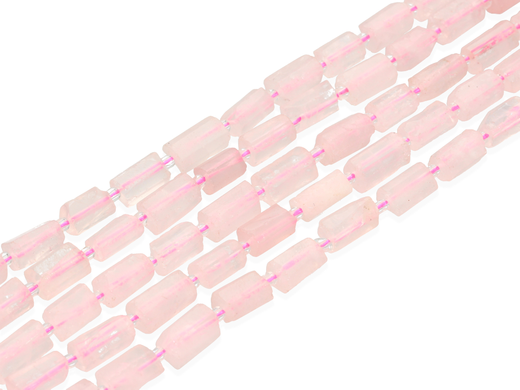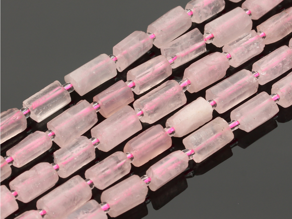 Kwarc różowy w kształcie ciosanego walca, sprzedawany w sznurach bez zapięcia, służących do samodzielnego tworzenia biżuterii. Cena dotyczy jednego sznura, który podczas kompletowania zamówienia jest wybierany losowo.