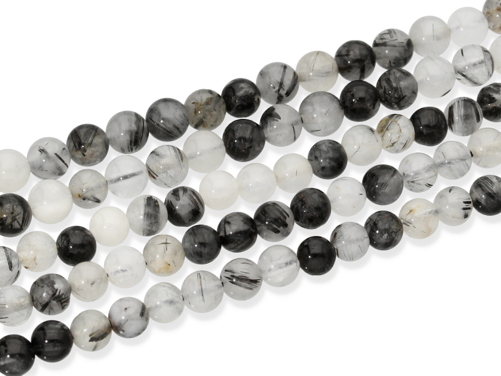 Kwarc z czarnym rutylem w kształcie kulki, sprzedawany w sznurach bez zapięcia, służących do samodzielnego tworzenia biżuterii. Cena dotyczy jednego sznura, który podczas kompletowania zamówienia jest wybierany losowo.