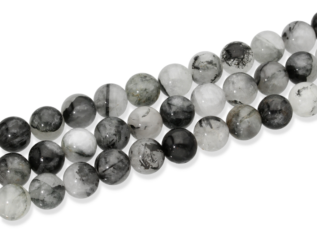 Kwarc z czarnym rutylem w kształcie kulki, sprzedawany w sznurach bez zapięcia, służących do samodzielnego tworzenia biżuterii. Cena dotyczy jednego sznura, który podczas kompletowania zamówienia jest wybierany losowo.