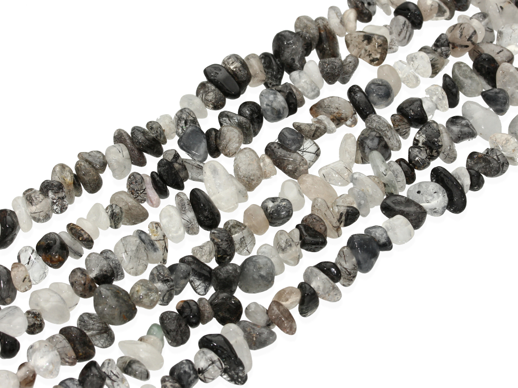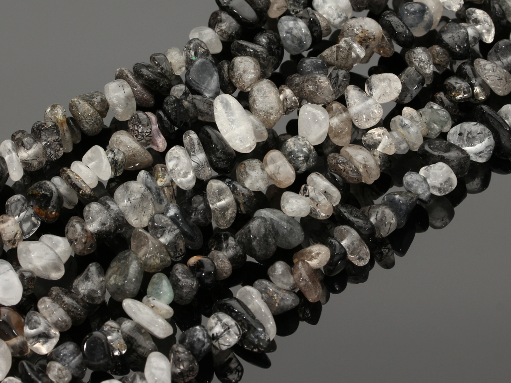 Kwarc z czarnym rutylem w kształcie sieczki, sprzedawany w sznurach bez zapięcia, służących do samodzielnego tworzenia biżuterii. Cena dotyczy jednego sznura, który podczas kompletowania zamówienia jest wybierany losowo.