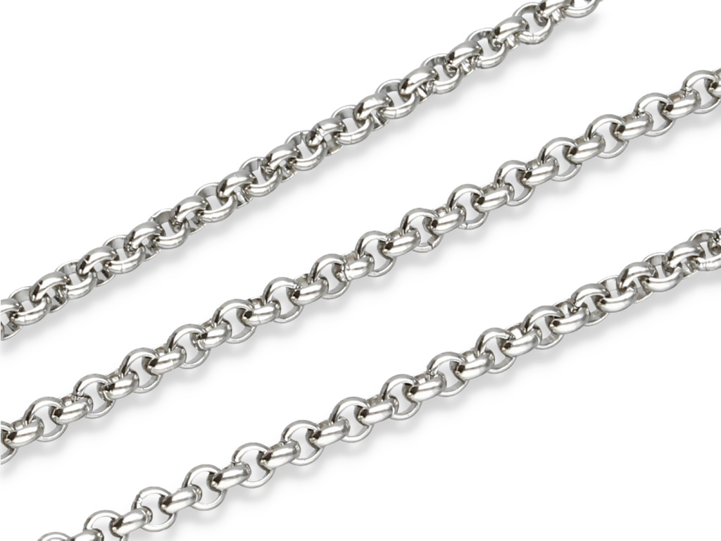 Stalowy łańcuszek "rolo". Przy zakupie do 24 opakowań, łańcuszek wysyłamy w jednym odcinku. Przy zakupie 25 opakowań łańcuszek wysyłamy na szpuli konfekcjonowanej u producenta zawierającej ok. 25 metrów +/- 3%.