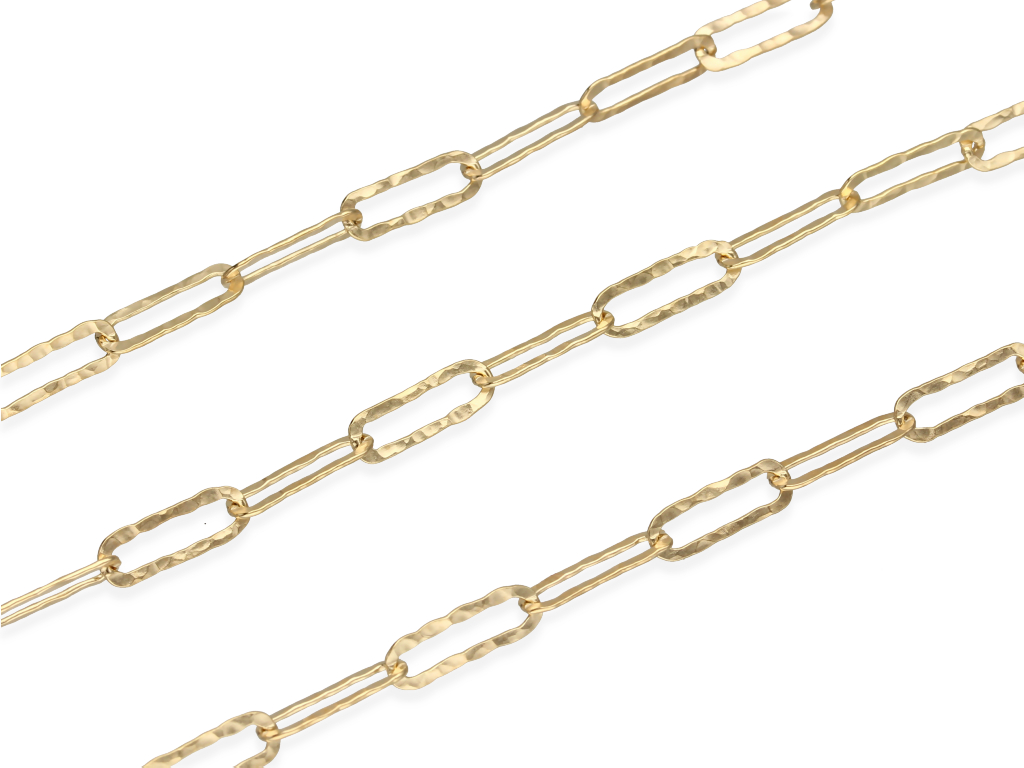 Łańcuszek "rolo prostokątne" posiadający młotkowane, lutowane ogniwa. Przy zakupie kilku opakowań, łańcuszek wysyłamy w jednym odcinku.