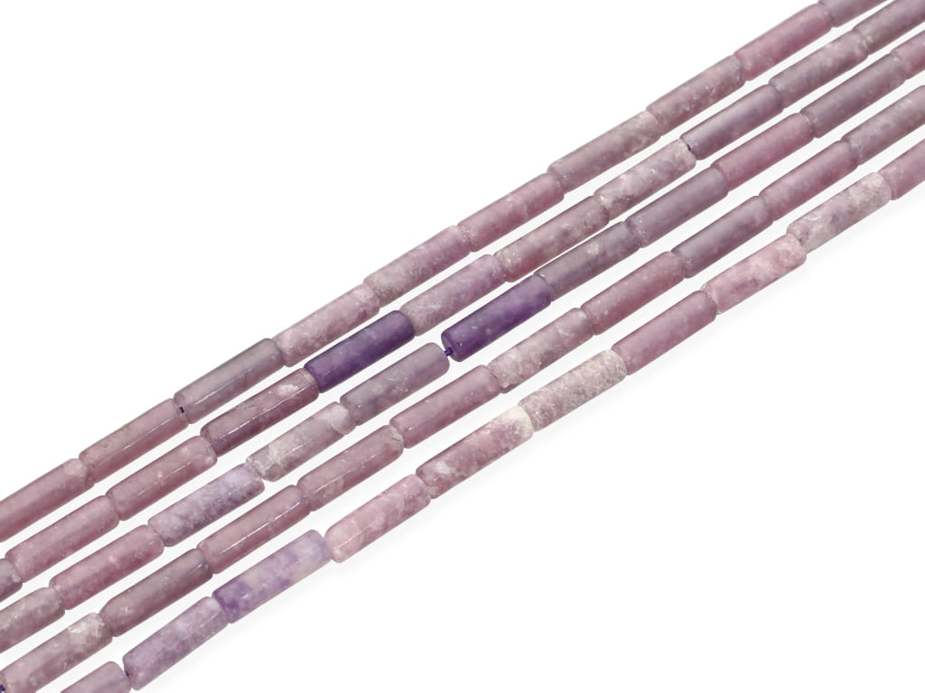 Lepidolit w kształcie rurki, sprzedawany w sznurach bez zapięcia, służących do samodzielnego tworzenia biżuterii. Cena dotyczy jednego sznura, który podczas kompletowania zamówienia jest wybierany losowo.