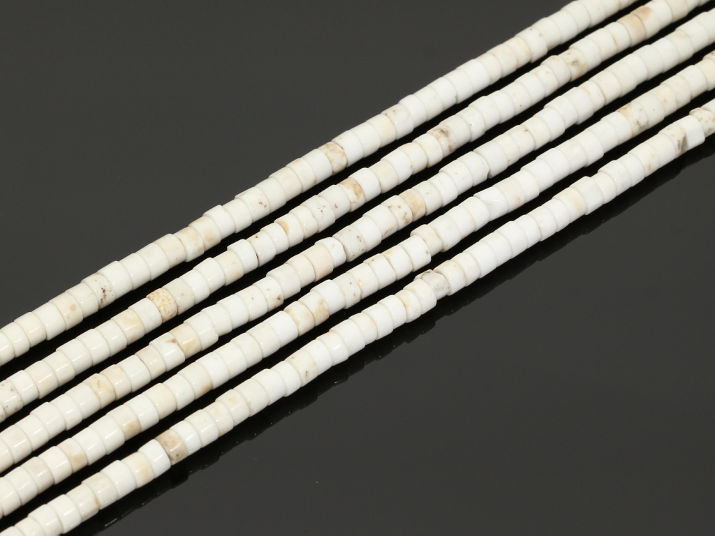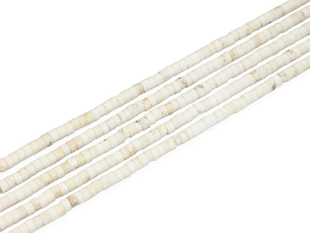 Naturalny magnezyt w kształcie plasterków, sprzedawany w sznurach bez zapięcia, służących do samodzielnego tworzenia biżuterii. Cena dotyczy jednego sznura, który podczas kompletowania zamówienia jest wybierany losowo.