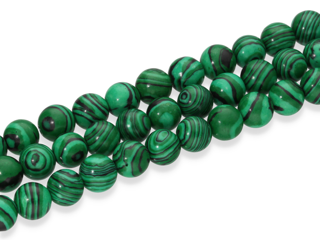 Malachit syntetyczny w kształcie kulki, sprzedawany w sznurach bez zapięcia, służących do samodzielnego tworzenia biżuterii. Cena dotyczy jednego sznura, który podczas kompletowania zamówienia jest wybierany losowo.